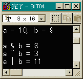 ビット演算の所と10進数の所をよく見て下さい。 上の計算の意味がわかったでしょうか?ビット演算 10進数 (1010)&(1001)=(1000)・・・10 & 9 = 8 (1010)^(1001)=(0011)・・・10 ^ 9 = 3 (1010)|(1001)=(1011)・・・10 | 9 = 11