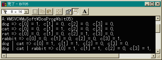 上のプログラムを実行すると・・・#include <stdio.h> void get_animal(int); int dog = 1, cat = 2, rat = 4, rabbit = 8; int c[4]; int main(void) { printf("dog => "); get_animal(dog); printf("cat => "); get_animal(cat); printf("rat => "); get_animal(rat); printf("rabbit => "); get_animal(rabbit); printf("dog | cat => "); get_animal(dog | cat); printf("dog | cat | rabbit => "); get_animal(dog | cat | rabbit); return 0; } void get_animal(int x) { int i; for (i = 0; i <= 3; i++) { c[i] = x % 2; x /= 2; printf("c[%d] = %d, ", i, c[i]); } printf("\n"); return; }