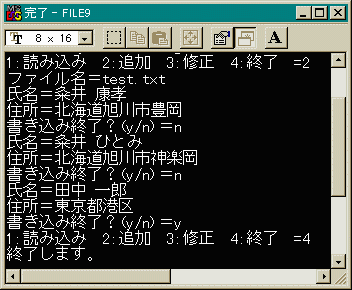 #include <stdio.h> #include <stdlib.h> #include <fcntl.h> #include <io.h> #include <string.h> #include <sys\types.h> #include <sys\stat.h> int read_file(void); int write_file(void); int edit_file(void); char file_name[32]; int hdl; int main(void) { char mode[8]; strcpy(file_name, " "); while(1) { printf("1:読み込み 2:追加 3:修正 4:終了 ="); gets(mode); if (mode[0] == '4') break; switch(atoi(mode)) { case 1:read_file(); break; case 2:write_file(); break; case 3:edit_file(); break; default: printf("入力エラーです。\n"); break; } } printf("終了します。\n"); return 0; } int read_file(void) { int cnt = 1; char name[21]; char address[41]; if (strcmp(file_name, " ") == 0) { printf("ファイル名="); gets(file_name); } hdl = _open(file_name, _O_RDONLY); if (hdl == -1) { printf("エラーです\n"); exit(-1); } while(_read(hdl, name, 20) > 0) { _read(hdl, address, 40); printf("[%2d]%s\n", cnt++, name); printf(" %s\n", address); } _close(hdl); return 0; } int write_file(void) { char name[21]; char address[41]; char yn[4]; long fp = 0; if (strcmp(file_name, " ") == 0) { printf("ファイル名="); gets(file_name); } hdl = _open(file_name, _O_WRONLY | _O_CREAT | _O_APPEND, _S_IREAD | _S_IWRITE); while(1) { memset(name, ' ', sizeof(name)); memset(address, ' ', sizeof(address)); printf("氏名="); gets(name); if (strcmp(name, "E") == 0) break; printf("住所="); gets(address); _write(hdl, name, 20); _write(hdl, address, 40); printf("書き込み終了?(y/n)="); gets(yn); if (yn[0] == 'y' || yn[0] == 'Y') break; } _close(hdl); return 0; } int edit_file(void) { char no[8], name[21], address[41], chk[4]; if (strcmp(file_name, " ") == 0) { printf("ファイル名="); gets(file_name); } hdl = _open(file_name, _O_RDWR); if (hdl == -1) { printf("エラーです\n"); exit(-1); } while(1) { printf("\n修正したいデータno="); gets(no); _lseek(hdl, 60L * (atoi(no) - 1) , SEEK_SET); _read(hdl, name, 20); _read(hdl, address, 40); printf("修正するデータは\n"); printf("[%2d]%s\n", atoi(no), name); printf(" %s\n", address); printf("これでよいですか(y/n)="); gets(chk); if (chk[0] == 'y' || chk[0] == 'n') { memset(name, ' ', sizeof(name)); memset(address, ' ', sizeof(address)); printf("氏名="); gets(name); printf("住所="); gets(address); _lseek(hdl, 60L * (atoi(no) - 1), SEEK_SET); _write(hdl, name, 20); _write(hdl, address, 40); } printf("もう1件修正しますか(y/n)="); gets(chk); if (chk[0] == 'n' || chk[0] == 'N') break; } _close(hdl); return 0; }