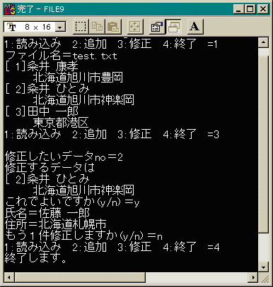 1つのデータは氏名20バイト、住所40バイト取っています。 従って3番目のデータは60*(3−1)バイト目からですね。 _lseekの所をよく見て下さい。後は説明は不要ですね。 念のために、このプログラムの全体を示しましょう。int edit_file(void) { char no[8], name[21], address[41], chk[4]; if (strcmp(file_name, " ") == 0) { printf("ファイル名="); gets(file_name); } hdl = _open(file_name, _O_RDWR); if (hdl == -1) { printf("エラーです\n"); exit(-1); } while(1) { printf("\n修正したいデータno="); gets(no); _lseek(hdl, 60L * (atoi(no) - 1) , SEEK_SET); _read(hdl, name, 20); _read(hdl, address, 40); printf("修正するデータは\n"); printf("[%2d]%s\n", atoi(no), name); printf(" %s\n", address); printf("これでよいですか(y/n)="); gets(chk); if (chk[0] == 'y' || chk[0] == 'Y') { memset(name, ' ', sizeof(name)); memset(address, ' ', sizeof(address)); printf("氏名="); gets(name); printf("住所="); gets(address); _lseek(hdl, 60L * (atoi(no) - 1), SEEK_SET); _write(hdl, name, 20); _write(hdl, address, 40); } printf("もう1件修正しますか(y/n)="); gets(chk); if (chk[0] == 'n' || chk[0] == 'N') break; } _close(hdl); return 0; }