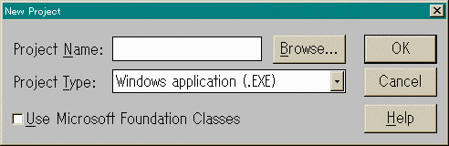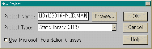 メニューから「Project」「 New」を選択すると左のような ダイアログボックスが出てきます。この時「Project Name」 にフルパスで直接書き込んでもよいのですが、面倒くさい場合は 「Browse...」ボタンを押します。そして目的の フォルダまで行ったら「ファイル名(N)」の所にmylib.mak のように名前を付けます。そうすると・・・