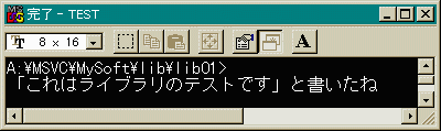 ライブラリは正しく動作しているようですね。 (こんな変な関数は何の役にもたたんなあ・・・) 次回は、もう少しましなライブラリを作ります。マイクロソフト以外のコンパイラを お使いの人はマニュアル等でライブラリの作り方を 研究してみて下さい。きっと似たような方法で作れるはずです。