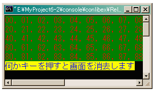 conlibex.hがインクルードされていることに注意してください。// conlibex.c #include <windows.h> #include <stdio.h> #include <conio.h> #include "conlibex.h" int main() { int i; my_setcolor(FOREGROUND_RED | FOREGROUND_INTENSITY | BACKGROUND_GREEN); for (i = 0; i < 100; i++) printf("%02d, ", i); my_setcolor(FOREGROUND_BLUE | FOREGROUND_INTENSITY | BACKGROUND_RED | BACKGROUND_GREEN | BACKGROUND_INTENSITY); printf("何かキーを押すと画面を消去します\n"); getch(); if (my_cls() != 0) printf("Error\n"); my_locate(0, 20); printf("終了します\n"); return 0; }