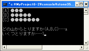 printf("どの山からとりますか(A,B,C)---");