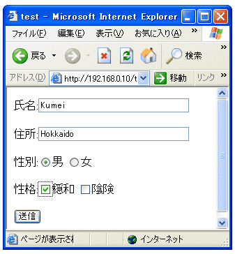 <HTML> <HEAD> <meta http-equiv="Content-Type" content="text/html; charset=Shift_JIS"> <TITLE>test</TITLE> </HEAD> <BODY> <FORM METHOD="POST" ACTION="cgi03.cgi"> 氏名:<INPUT TYPE="TEXT" SIZE="40" NAME="namae"><P> 住所:<INPUT TYPE="TEXT" SIZE="40" NAME="jusho"><P> 性別:<INPUT TYPE="radio" NAME="SEX" VALUE="MALE">男 <INPUT TYPE="radio" NAME="SEX" VALUE="FEMALE">女<P> 性格:<INPUT TYPE="checkbox" NAME="ONWA">穏和 <INPUT TYPE="checkbox" NAME="INKEN">陰険<P> <INPUT TYPE="SUBMIT" VALUE="送信"> </FORM> </BODY> </HTML>