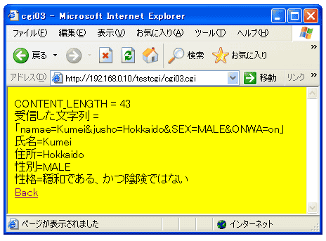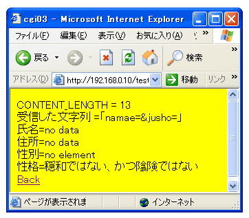 さて、今回のCGIは漢字には対応していません。フォームに漢字を入力した 場合どのようになるか観察してみてください。