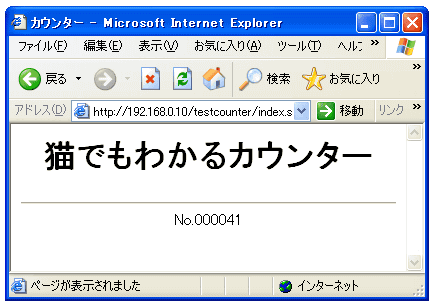 <HTML> <HEAD> <meta http-equiv="Content-Type" content="text/html; charset=Shift_JIS"> <TITLE>カウンター</TITLE> </HEAD> <BODY> <CENTER> <H1>猫でもわかるカウンター</H1> <HR> <!--#exec cmd="count01.cgi"--><BR> </CENTER> </BODY> </HTML>(通常cgiの実行できるディレクトリは限定されているのでcount01.cgiにはパス名がついています。)