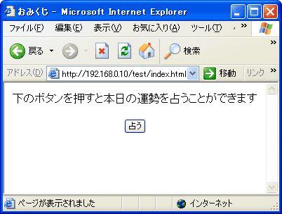 <HTML> <HEAD> <meta http-equiv="Content-Type" content="text/html; charset=Shift_JIS"> <TITLE>おみくじ</TITLE> </HEAD> <BODY> <CENTER> 下のボタンを押すと本日の運勢を占うことができます <FORM METHOD="GET" ACTION="kuji02.cgi"> <INPUT TYPE="SUBMIT" VALUE="占う"> </FORM> </CENTER> </BODY> </HTML>CGIの名前がkuji02.cgiになったので、ここだけが前章と異なります。