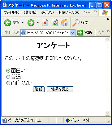 <HTML> <HEAD> <meta http-equiv="Content-Type" content="text/html; charset=Shift_JIS"> <TITLE>アンケート</TITLE> </HEAD> <BODY> <CENTER> <H2>アンケート</H2> </CENTER> このサイトの感想をお知らせください。<BR> <FORM METHOD="POST" ACTION="ques01.cgi"> <INPUT TYPE="radio" NAME="KANSO" VALUE="OMOSHIROI" CHECKED>面白い<BR> <INPUT TYPE="radio" NAME="KANSO" VALUE="FUTSU">普通<BR> <INPUT TYPE="radio" NAME="KANSO" VALUE="OMOSHIROKUNAI">面白くない<BR> <CENTER> <INPUT TYPE="SUBMIT" VALUE="送信"> <INPUT TYPE="BUTTON" VALUE="結果を見る" onClick="location='result01.cgi'"> </CENTER> </FORM> </BODY> </HTML>CGIのファイルは通常決められた位置でしか実行できないようになっているので、実際には ACTION="ques01.cgi"のところには、パスがつきます。