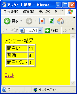 再度書き込みます。カウンターの時とほとんど同じ要領です。これで、「送信」ボタンを押すと、選択された項目のファイルの数値を1増やす仕組みが できました。つぎは、アンケート結果を読み出すプログラムです。