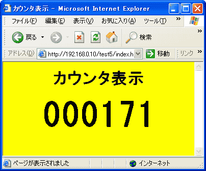 <HTML> <HEAD> <meta http-equiv="Content-Type" content="text/html; charset=Shift_JIS"> <TITLE>カウンタ表示</TITLE> </HEAD> <BODY BGCOLOR="yellow"> <CENTER> <H1>カウンタ表示</H1> <IMG SRC="img02.cgi?1"> <IMG SRC="img02.cgi?2"> <IMG SRC="img02.cgi?3"> <IMG SRC="img02.cgi?4"> <IMG SRC="img02.cgi?5"> <IMG SRC="img02.cgi?6"> </CENTER> </BODY> </HTML>これを見てわかるように、IMGタグのところでCGIプログラム(img02.cgi)を呼び出しています。 また、プログラム名の後に「?」マークを入れて、プログラムに渡すデータを記載しています。 この場合、カウンタの先頭から順番に1,2,...6としてあります。(6桁表示)