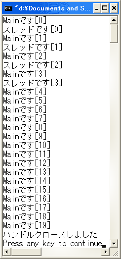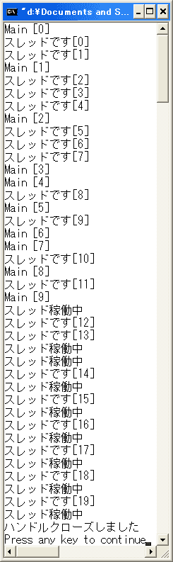 main関数側では、「Mainです[X]」を20回表示します。その後CloseHandle関数で、スレッドハンドルをクローズしています。