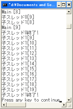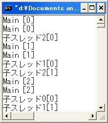 Main[0]や、Main[1]が2回も表示されていますね。プログラム・ソースを見ても こんなことが起るとは予想できません。また、試行のたびに結果は異なります。