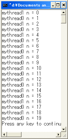 スレッド0とスレッド1が交互に、nを表示しているのがわかります。nもきちんと0から19まで