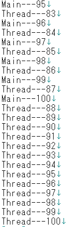 まず、子スレッドを作ります。次にtest.txtファイルを"a"モードで開きます。 これに、「Main---1」と書き込みます。 そしてファイルを閉じます。 次に、また同じファイルを開いて 「Main---2」と書き込みます。 これを100回繰り返します。