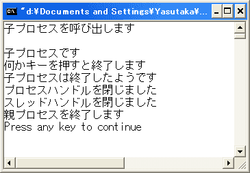 また、CreateProcess関数で作成したプロセスが終了してもこのプロセスのプロセスハンドル、スレッドハンドルはシステム内に残ってしまうのでCloseHandle関数でクローズしなくてはいけません。