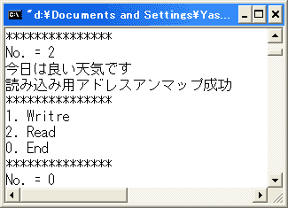 BOOL UnmapViewOfFile( LPCVOID lpBaseAddress // 開始アドレス );アンマップに成功したら0以外が、失敗すると0が返されます。