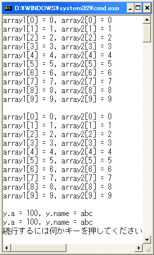 また、xという構造体を用意してx.aに100を、x.nameに"abc"を格納しています。 これをmemcpyとmemcpy_s関数を利用してyにコピーしています。