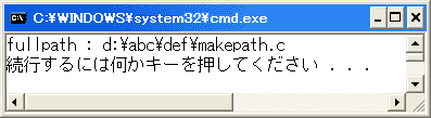 errno_t _makepath_s( char *path, size_t sizeInCharacters, const char *drive, const char *dir, const char *fname, const char *ext );pathは、完全パス名を格納するバッファです。
