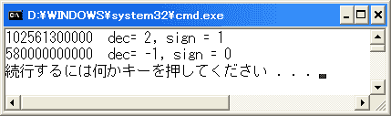 /* fcvt01.c */ #include実行結果は次のようになります。#include int main() { double f1 = -1.23456789, f2 = 123.45; char buf[16]; int dec, sign; _fcvt_s(buf, sizeof(buf), f1, 1, &dec, &sign); printf("%s dec = %d, sign = %d\n", buf, dec, sign); _fcvt_s(buf, sizeof(buf), f2, 4, &dec, &sign); printf("%s dec = %d, sign = %d\n", buf, dec, sign); return 0; }