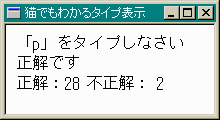 クライアント領域に表示されるモノですね。中身は次のOnChar()関数で用意します。void CMyWindow::OnPaint() { char *str_org = "「%c」をタイプしなさい"; char str[256]; char *str_h = "正解:%2d 不正解:%2d"; int len; CPaintDC dc(this); len = wsprintf(str, str_org, szAbc[q]); dc.TextOut(10, 10, str, len); dc.TextOut(10, 30, szKaito, strlen(szKaito)); len = wsprintf(str, str_h, nOk, nNo); dc.TextOut(10, 50, str, len); }
