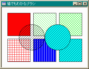 今回のプログラムも簡単でした。いろいろ自分でグラフィクスを描画して 実験してみてください。void CMyWindow::OnPaint() { CPaintDC dc(this); static CBrush brush[6], *pOldBrush; COLORREF crOld; int nOldBkMode; //ソリッドブラシの「赤」を作成 brush[0].CreateSolidBrush(RGB(255, 0, 0)); pOldBrush = (CBrush*)dc.SelectObject(&brush[0]); dc.Rectangle(20, 20, 20 + 80, 20 + 80); //ハッチブラシを作成 brush[1].CreateHatchBrush(HS_CROSS, RGB(255, 0, 0)); dc.SelectObject(&brush[1]); dc.Rectangle(20, 110, 20 + 80, 110 + 80); //別なハッチブラシを作成 brush[2].CreateHatchBrush(HS_FDIAGONAL, RGB(0, 255, 0)); dc.SelectObject(&brush[2]); dc.Rectangle(110, 20, 110 + 80, 20 + 80); //また別のハッチブラシを作成、さらにバックグラウンドカラーを //青に変更 brush[3].CreateHatchBrush(HS_VERTICAL, RGB(255, 255, 255)); dc.SelectObject(&brush[3]); crOld = dc.SetBkColor(RGB(0, 0, 255)); dc.Rectangle(110, 110, 110 + 80, 110 + 80); //別のハッチブラシを作成、バックを元に戻す brush[4].CreateHatchBrush(HS_DIAGCROSS, RGB(0, 255, 0)); dc.SetBkColor(crOld); dc.SelectObject(&brush[4]); dc.Rectangle(200, 20, 200 + 80, 20 + 80); //別のハッチブラシを作成、バックを水色に変更 brush[5].CreateHatchBrush(HS_BDIAGONAL, RGB(0, 0, 0)); dc.SelectObject(&brush[5]); crOld = dc.SetBkColor(RGB(0, 255, 255)); dc.Rectangle(200, 110, 200 + 80, 110 + 80); //バックモードをTRANSPARENTに変更 nOldBkMode = dc.SetBkMode(TRANSPARENT); dc.Ellipse(60, 60, 150, 150); //バックモードを元に戻す dc.SetBkMode(nOldBkMode); dc.Ellipse(150, 60, 240, 150); //ブラシ、バックグラウンドカラーを元に戻す dc.SelectObject(pOldBrush); dc.SetBkColor(crOld); }