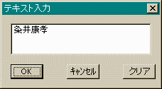 今回のリソース・スクリプトはシンプルです。// dlg03.rcの一部 ///////////////////////////////////////////////////////////////////////////// // // Dialog // MYDLG DIALOG DISCARDABLE 0, 0, 127, 67 STYLE DS_MODALFRAME | WS_POPUP | WS_CAPTION | WS_SYSMENU CAPTION "テキスト入力" FONT 9, "MS Pゴシック" BEGIN DEFPUSHBUTTON "OK",IDOK,7,46,26,14 PUSHBUTTON "キャンセル",IDCANCEL,52,46,26,14 EDITTEXT IDC_EDIT1,7,7,113,30,ES_AUTOHSCROLL PUSHBUTTON "クリア",IDC_CLEAR,97,46,26,14 END