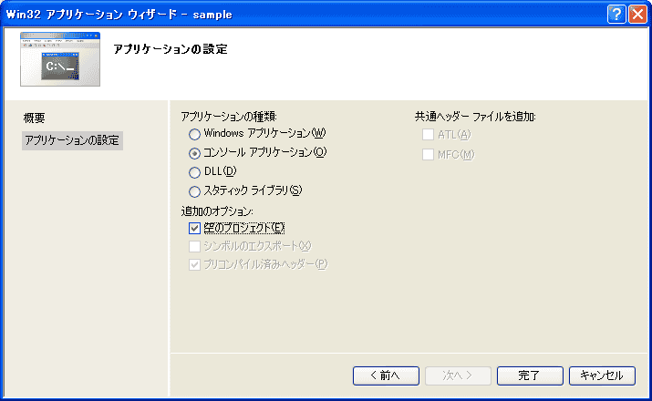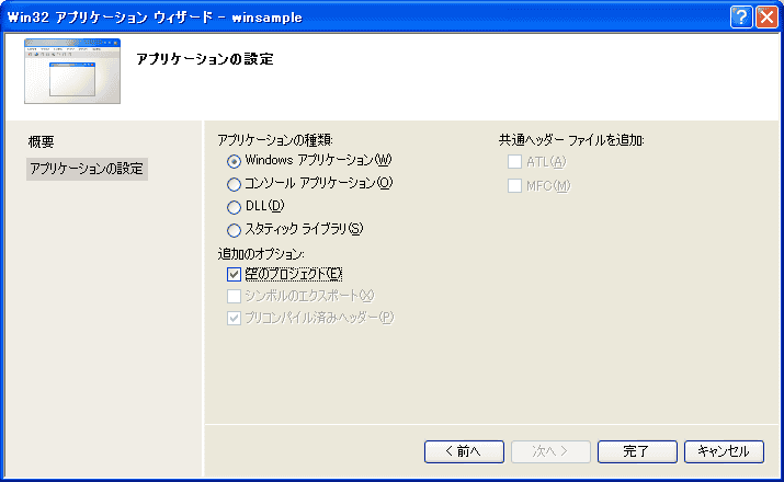 「アプリケーションウィザード」では、アプリケーションの種類を「Windowsアプリケーション」、追加のオプションを「空のプロジェクト」にします。