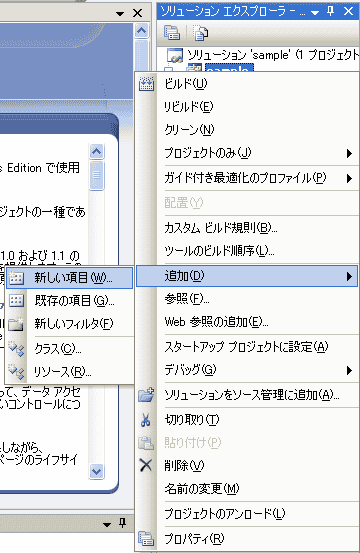 VS2005のソリューションエクスプローラで、今作った「sample」を右クリックします。