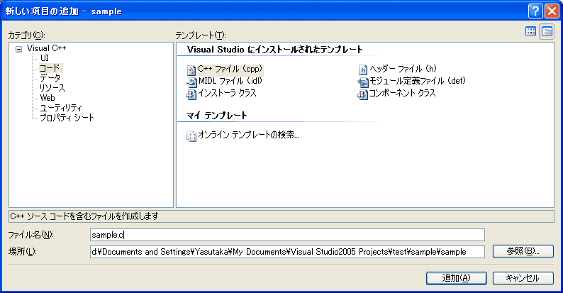ここでは、プロジェクト名が「sample」なのでソースファイル名はsample.cとします。 注意すべき点は、ソースファイルに「.c」まで指定しないと、拡張子が自動的に「.cpp」となってしまいます。
