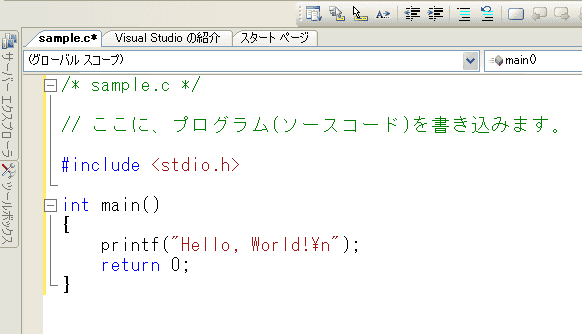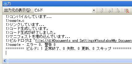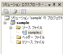 ソリューションエクスプローラで、「sample.c」がプロジェクトに加わっていることを確認します。