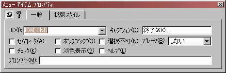 これは、その下にサブ項目が出てくることを意味します。 左の例では「ファイル」にはIDはありませんが、「終了」には 適当なID(IDM_ENDなど)をつけます。これはダプルクォーテーションで くくってはいけません。