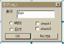 VC++のリソース・エディタを使っている人は 「あれー、ずいぶん短いな」と思われるかもしれません。 VC++が自動的にいろいろなことをするために 勝手に?いろいろつけ加えているのです。 そのままでももちろんかまいませんが、筆者は よけいなところをバッサリ削除してresource.hも使わないようにしています。 必要なのは、上に示した部分だけです。// timer.rc #include "windows.h" #include "timer.h" ///////////////////////////////////////////////////////////////////////////// // // Dialog // OPTDLG DIALOG DISCARDABLE 0, 0, 117, 77 STYLE DS_MODALFRAME | WS_POPUP | WS_CAPTION | WS_SYSMENU CAPTION "オプション" FONT 9, "MS Pゴシック" BEGIN DEFPUSHBUTTON "OK",IDOK,7,59,50,14 PUSHBUTTON "キャンセル",IDCANCEL,60,59,50,14 LTEXT "表示",IDC_STATIC,8,5,15,8 EDITTEXT IDC_EDIT1,29,6,76,20,ES_AUTOHSCROLL CONTROL "時刻",IDC_RADIO1,"Button",BS_AUTORADIOBUTTON,14,31,30, 10 CONTROL "日付",IDC_RADIO2,"Button",BS_AUTORADIOBUTTON,15,46,30, 10 CONTROL "check1",IDC_CHECK1,"Button",BS_AUTOCHECKBOX | WS_TABSTOP,67,32,37,10 CONTROL "check2",IDC_CHECK2,"Button",BS_AUTOCHECKBOX | WS_TABSTOP,66,44,37,10 END