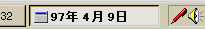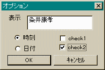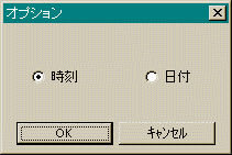 オプションで、「日付」を選択すると次のようになります。// timer.cpp #include <windows.h> #include <time.h> #include <stdio.h> #include "timer.h" LRESULT CALLBACK WndProc(HWND, UINT, WPARAM, LPARAM); LRESULT CALLBACK MyDlgProc(HWND, UINT, WPARAM, LPARAM); BOOL InitApp(HINSTANCE, LPCSTR); BOOL InitInstance(HINSTANCE, LPCSTR, int); int GetTimeStr(int); int SetWinCenter(HWND); HINSTANCE hInst1; char time_str[64]; int radio1 = 1; int radio2 = 0; //ラジオボタンが押されているかどうか int WINAPI WinMain(HINSTANCE hCurInst, HINSTANCE hPrevInst, LPSTR lpsCmdLine, int nCmdShow) { MSG msg; char szClassName[] = "timer"; //ウィンドウクラス hInst1 = hCurInst; if (!hPrevInst) { if (!InitApp(hCurInst, szClassName)) return FALSE; } if (!InitInstance(hCurInst, szClassName, nCmdShow)) { return FALSE; } while (GetMessage(&msg, NULL, 0, 0)) { TranslateMessage(&msg); DispatchMessage(&msg); } return msg.wParam; } //ウィンドウ・クラスの登録 BOOL InitApp(HINSTANCE hInst, LPCSTR szClassName) { WNDCLASS wc; wc.style = CS_HREDRAW | CS_VREDRAW; wc.lpfnWndProc = WndProc; //プロシージャ名 wc.cbClsExtra = 0; wc.cbWndExtra = 0; wc.hInstance = hInst; //インスタンス wc.hIcon = LoadIcon(NULL, IDI_APPLICATION); wc.hCursor = LoadCursor(NULL, IDC_ARROW); wc.hbrBackground = GetStockObject(WHITE_BRUSH); wc.lpszMenuName = NULL/*"TIMERMENU"*/; //メニュー名 wc.lpszClassName = (LPCSTR)szClassName; return (RegisterClass(&wc)); } //ウィンドウの生成 BOOL InitInstance(HINSTANCE hInst, LPCSTR szClassName, int nCmdShow) { HWND hWnd; HMENU hMenu; int i; hWnd = CreateWindow(szClassName, NULL, //タイトルバーにこの名前が表示されます WS_CAPTION | WS_SYSMENU, //ウィンドウの種類 9999, //X座標 9999, //Y座標 0, //幅 0, //高さ NULL, //親ウィンドウのハンドル、親を作るときはNULL NULL, //メニューハンドル、クラスメニューを使うときはNULL hInst, //インスタンスハンドル NULL); if (!hWnd) return FALSE; ShowWindow(hWnd, SW_MINIMIZE); UpdateWindow(hWnd); hMenu = GetSystemMenu(hWnd, FALSE); for (i = 0; i <= 5; i++) DeleteMenu(hMenu, 0, MF_BYPOSITION); AppendMenu(hMenu, MF_STRING, IDM_OPTION, "オプション"); DrawMenuBar(hWnd); return TRUE; } //ウィンドウプロシージャ LRESULT CALLBACK WndProc(HWND hWnd, UINT msg, WPARAM wp, LPARAM lp) { int id; switch (msg) { case WM_SYSCOMMAND: switch (wp) { case IDM_OPTION: DialogBox(hInst1, "OPTDLG", hWnd, (DLGPROC)MyDlgProc); break; default: return(DefWindowProc(hWnd, msg, wp, lp)); break; } break; case WM_CREATE: if(SetTimer(hWnd, ID_MYTIMER, 1000, NULL) == 0) { MessageBox(hWnd, (LPCSTR)"タイマー失敗!", (LPCSTR)"失敗", MB_OK | MB_ICONEXCLAMATION); } break; case WM_TIMER: GetTimeStr(radio1); SetWindowText(hWnd, (LPCSTR)time_str); break; case WM_CLOSE: id = MessageBox(hWnd, (LPCSTR)"終了してもよいですか", (LPCSTR)"終了確認", MB_YESNO | MB_ICONQUESTION); if (id == IDYES) { if(KillTimer(hWnd, ID_MYTIMER) == TRUE) { MessageBox(hWnd, (LPCSTR)"タイマーを殺しました!", (LPCSTR)"タイマー削除の成功", MB_OK | MB_ICONEXCLAMATION); } DestroyWindow(hWnd); } break; case WM_DESTROY: PostQuitMessage(0); break; default: return (DefWindowProc(hWnd, msg, wp, lp)); } return 0L; } int GetTimeStr(int sw) { char *str_org1 = "%2d時%2d分%2d秒"; char *str_org2 = "%2d年%2d月%2d日"; time_t long_time; struct tm *now_time; time(&long_time); now_time = localtime(&long_time); switch (sw) { case 1: sprintf(time_str, str_org1, now_time->tm_hour, now_time->tm_min, now_time->tm_sec); break; case 0: sprintf(time_str, str_org2, now_time->tm_year, now_time->tm_mon + 1, now_time->tm_mday); break; default: MessageBox(NULL, (LPCSTR)"エラーです", (LPCSTR)"エラー", MB_OK); return (-1); } return 0; } //ダイアログプロシージャ LRESULT CALLBACK MyDlgProc(HWND hDlgWnd, UINT msg, WPARAM wp, LPARAM lp) { switch (msg) { case WM_INITDIALOG: SendMessage(GetDlgItem(hDlgWnd, IDC_RADIO1), BM_SETCHECK, (WPARAM)radio1, 0L); SendMessage(GetDlgItem(hDlgWnd, IDC_RADIO2), BM_SETCHECK, (WPARAM)radio2, 0L); SetWinCenter(hDlgWnd); return TRUE; case WM_COMMAND: switch (LOWORD(wp)) { case IDOK: if(IsDlgButtonChecked(hDlgWnd, IDC_RADIO1) == BST_CHECKED) { radio1 = 1; } else { radio1 = 0;} if(IsDlgButtonChecked(hDlgWnd, IDC_RADIO2) == BST_CHECKED) { radio2 = 1; } else { radio2 = 0;} EndDialog(hDlgWnd, IDOK); break; case IDCANCEL: EndDialog(hDlgWnd, IDCANCEL); break; default: return FALSE; } default: return FALSE; } return TRUE; } int SetWinCenter(HWND hWnd) { HWND hDeskWnd; RECT deskrc, rc; int x, y; hDeskWnd = GetDesktopWindow(); GetWindowRect(hDeskWnd, (LPRECT)&deskrc); GetWindowRect(hWnd, (LPRECT)&rc); x = (deskrc.right - (rc.right-rc.left)) / 2; y = (deskrc.bottom - (rc.bottom-rc.top)) / 2; SetWindowPos(hWnd, HWND_TOP, x, y, (rc.right-rc.left), (rc.bottom-rc.top),SWP_SHOWWINDOW); return 0; }