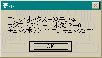 では、呼び出し側も修正しましょう。ウィンドウプロシージャの中の WM_TIMERの所をほんの少し書き直すだけです。int GetTimeStr(int sw) { char *str_org1 = "%2d時%2d分%2d秒"; char *str_org2 = "%2d年%2d月%2d日"; time_t long_time; struct tm *now_time; time(&long_time); now_time = localtime(&long_time); switch (sw) { case 1: sprintf(time_str, str_org1, now_time->tm_hour, now_time->tm_min, now_time->tm_sec); break; case 0: sprintf(time_str, str_org2, now_time->tm_year, now_time->tm_mon + 1, now_time->tm_mday); break; default: MessageBox(NULL, (LPCSTR)"エラーです", (LPCSTR)"エラー", MB_OK); return (-1); } return 0; }