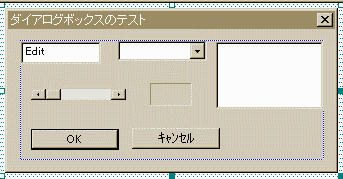 さて、メニューも次のように作りましょう。///////////////////////////////////////////////////////////////////////////// // // Dialog // MYDIALOG DIALOG DISCARDABLE 0, 0, 187, 93 STYLE DS_MODALFRAME | WS_POPUP | WS_CAPTION | WS_SYSMENU CAPTION "ダイアログボックスのテスト" FONT 9, "MS Pゴシック" BEGIN DEFPUSHBUTTON "OK",IDOK,13,66,50,14 PUSHBUTTON "キャンセル",IDCANCEL,71,65,50,14 EDITTEXT IDC_EDIT1,7,7,47,16,ES_AUTOHSCROLL LISTBOX IDC_LIST1,118,7,62,46,LBS_NOINTEGRALHEIGHT | WS_VSCROLL | WS_TABSTOP COMBOBOX IDC_COMBO1,63,7,51,47,CBS_DROPDOWN | WS_VSCROLL | WS_TABSTOP LTEXT "",IDC_STATIC1,81,35,24,15,SS_SUNKEN SCROLLBAR IDC_SCROLL1,13,39,54,7 END