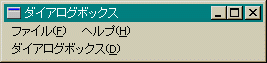 これで、どんなプログラムを作ろうとしているのかというと ダイアログボックスで、いろいろ入力した事項をクライアント 領域に表示するといった簡単なものです。///////////////////////////////////////////////////////////////////////////// // // Menu // MYMENU MENU DISCARDABLE BEGIN POPUP "ファイル(&F)" BEGIN MENUITEM "終了(&Q)", IDM_END END POPUP "ヘルプ(&H)" BEGIN MENUITEM "About(&A)", IDM_ABOUT END MENUITEM "ダイアログボックス(&D)", IDM_DLG END