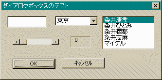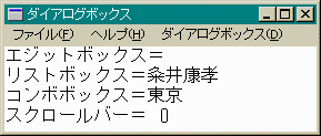 この関数の中身をそのまま、ダイアローグプロシージャに書いても同じこと ですが、長ったらしくなるので関数にまとめただけです。 SetWindowText関数については第15章ではSetDlgItemText 関数を使いました。どちらを使っても結果は同じです。 エジットボックスに表示する文字列ですね。int initDlg(HWND hDlgWnd) { int i; SetWindowText(GetDlgItem(hDlgWnd, IDC_EDIT1), (LPCTSTR)edit_str); SetScrollRange(GetDlgItem(hDlgWnd, IDC_SCROLL1), SB_CTL, ScrMin, ScrMax, TRUE); ShowScroll(hDlgWnd); for ( i = 0; i <= 4; i++ ) SendMessage(GetDlgItem(hDlgWnd, IDC_LIST1), LB_INSERTSTRING, (WPARAM)i, (LPARAM)liststr[i]); SendMessage(GetDlgItem(hDlgWnd, IDC_LIST1), LB_SETCURSEL, (WPARAM)ListNo, 0L); for ( i = 0; i <= 3; i++ ) SendMessage(GetDlgItem(hDlgWnd, IDC_COMBO1), CB_INSERTSTRING, (WPARAM)i, (LPARAM)combostr[i]); SendMessage(GetDlgItem(hDlgWnd, IDC_COMBO1), CB_SETCURSEL, (WPARAM)ComboNo, 0L); return 0; }