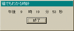 // dialog02.rc #include <windows.h> #include "dialog02.h" ///////////////////////////////////////////////////////////////////////////// // // Dialog // MYDIALOG DIALOG DISCARDABLE 0, 0, 134, 51 STYLE DS_MODALFRAME | WS_POPUP | WS_CAPTION CAPTION "猫でもわかる時計" FONT 9, "MS Pゴシック" BEGIN DEFPUSHBUTTON "終了",IDOK,48,23,37,14 LTEXT "午後",IDC_AMPM,13,7,15,8 LTEXT "",IDC_HOUR,34,7,11,8 LTEXT "時",IDC_STATIC,51,7,8,8 LTEXT "",IDC_MIN,65,7,11,8 LTEXT "分",IDC_STATIC,82,7,8,8 LTEXT "",IDC_SEC,96,7,11,8 LTEXT "秒",IDC_STATIC,108,7,8,8 END