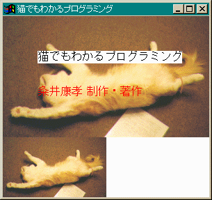 リソース・スクリプトはどうなっているかというと// grph04.cpp #include <windows.h> LRESULT CALLBACK WndProc(HWND, UINT, WPARAM, LPARAM); void ShowMyBMP(HWND, HDC); char szClassNme[] = "grph04"; int WINAPI WinMain(HINSTANCE hInstance, HINSTANCE hPreInst, LPSTR lpszCmdLine, int nCmdShow) { HWND hWnd; MSG lpMsg; WNDCLASS myProg; if (!hPreInst) { myProg.style =CS_HREDRAW | CS_VREDRAW; myProg.lpfnWndProc =WndProc; myProg.cbClsExtra =0; myProg.cbWndExtra =0; myProg.hInstance =hInstance; myProg.hIcon =NULL; myProg.hCursor =LoadCursor(NULL, IDC_ARROW); myProg.hbrBackground =GetStockObject(WHITE_BRUSH); myProg.lpszMenuName =NULL; myProg.lpszClassName =szClassNme; if (!RegisterClass(&myProg)) return FALSE; } hWnd = CreateWindow(szClassNme, "猫でもわかるプログラミング", WS_OVERLAPPEDWINDOW, CW_USEDEFAULT, CW_USEDEFAULT, CW_USEDEFAULT, CW_USEDEFAULT, NULL, NULL, hInstance, NULL); ShowWindow(hWnd, nCmdShow); UpdateWindow(hWnd); while (GetMessage(&lpMsg, NULL, 0, 0)) { TranslateMessage(&lpMsg); DispatchMessage(&lpMsg); } return (lpMsg.wParam); } LRESULT CALLBACK WndProc(HWND hWnd, UINT msg, WPARAM wParam, LPARAM lParam) { HDC hdc; PAINTSTRUCT ps; switch (msg) { case WM_DESTROY: PostQuitMessage(0); break; case WM_PAINT: hdc = BeginPaint(hWnd, &ps); ShowMyBMP(hWnd, hdc); TextOut(hdc, 50, 50, "猫でもわかるプログラミング", 26); SetBkMode(hdc, TRANSPARENT); SetTextColor(hdc, RGB(255, 0, 0)); TextOut(hdc, 50, 100, "粂井康孝 制作・著作", 19); EndPaint(hWnd, &ps); break; default: return(DefWindowProc(hWnd, msg, wParam, lParam)); } return (0L); } void ShowMyBMP(HWND hWnd, HDC hdc) { HDC hmdc; HBITMAP hBitmap; BITMAP bmp; HINSTANCE hInst; int BMP_W, BMP_H; hInst = (HINSTANCE)GetWindowLong(hWnd, GWL_HINSTANCE); hBitmap = LoadBitmap(hInst, "MYBMP"); GetObject(hBitmap, sizeof(BITMAP), &bmp); BMP_W = (int)bmp.bmWidth; BMP_H = (int)bmp.bmHeight; hmdc = CreateCompatibleDC(hdc); SelectObject(hmdc, hBitmap); BitBlt(hdc, 0, 0, BMP_W, BMP_H, hmdc, 0, 0, SRCCOPY); StretchBlt(hdc, 0, BMP_H, BMP_W / 2, BMP_H / 2, hmdc, 0, 0, BMP_W, BMP_H, SRCCOPY); DeleteDC(hmdc); DeleteObject(hBitmap); return; }