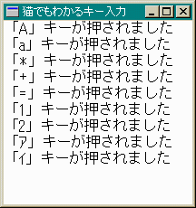 考えます。特殊キー以外のキーが押されて、押されたキーの文字コードが 生成されたときWM_CHARメッセージが通知されます。 これを捕まえればよいわけです。 このとき、wParamを調べるとキャラクターコードがわかります。
