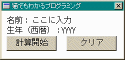 大変長いのですが、よく見ると簡単です。 WM_CREATEのところで、エジットコントロール2つと、 ボタンコントロール2つを作っています。//ウィンドウプロシージャ LRESULT CALLBACK WndProc(HWND hWnd, UINT msg, WPARAM wp, LPARAM lp) { int id; PAINTSTRUCT ps; HDC hdc; HINSTANCE hInst; switch (msg) { case WM_CREATE: hInst = ((LPCREATESTRUCT)lp)->hInstance; hEWnd1 = CreateWindow("EDIT", "ここに入力", WS_CHILD | WS_VISIBLE, 60, 10, 100, 20, hWnd, (HMENU)ID_EDIT1, hInst, NULL); hEWnd2 = CreateWindow("EDIT", "YYYY", WS_CHILD | WS_VISIBLE, 120, 30, 100, 20, hWnd, (HMENU)ID_EDIT2, hInst, NULL); hBWnd1 = CreateWindow("BUTTON", "計算開始", WS_CHILD | WS_VISIBLE | BS_PUSHBUTTON, 10, 50, 100, 30, hWnd, (HMENU)ID_BUTTON1, hInst, NULL); hBWnd2 = CreateWindow("BUTTON", "クリア", WS_CHILD | WS_VISIBLE | BS_PUSHBUTTON, 130, 50, 100, 30, hWnd, (HMENU)ID_BUTTON2, hInst, NULL); break; case WM_PAINT: hdc = BeginPaint(hWnd, &ps); TextOut(hdc, 10, 10, (LPCTSTR)"名前:", 6); TextOut(hdc, 10, 30, (LPCTSTR)"生年(西暦):", 14); EndPaint(hWnd, &ps); break; case WM_COMMAND: switch (LOWORD(wp)) { case ID_BUTTON1: GetWindowText(hEWnd1, (LPTSTR)name, 30); GetWindowText(hEWnd2, (LPTSTR)birth, 30); CalcAge(hWnd); break; case ID_BUTTON2: SetWindowText(hEWnd1, NULL); SetWindowText(hEWnd2, NULL); break; default: return(DefWindowProc(hWnd, msg, wp,lp)); } break; case WM_CLOSE: id = MessageBox(hWnd, (LPCSTR)"終了してもよいですか", (LPCSTR)"終了確認", MB_YESNO | MB_ICONQUESTION); if (id == IDYES) { DestroyWindow(hWnd); } break; case WM_DESTROY: PostQuitMessage(0); break; default: return (DefWindowProc(hWnd, msg, wp, lp)); } return 0L; }