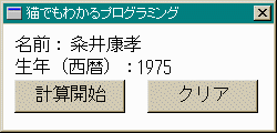 インスタンスハンドルの取得については、いろいろな方法が ありますので第19章を参照してください。 WM_PAINTのところでは、単に「名前」と「生年(西暦)」 を表示しているだけです。 WM_COMMANDのところでは、ボタンが押されたときの 処理をしています。押されたボタンがID_BUTTON1ならば、 エジットコントロールからかかれている文字列を取得して、 年齢計算関数(自作)を呼び出しています。