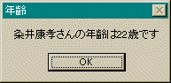 最後に、年齢計算の関数です。現在の西暦から 生まれた年を引いて、メッセージボックスで表示するだけです。 GetLocalTime関数については、すでに第10章で少しだけ 触れていますが、使い方については解説していませんでした。 簡単です。int CalcAge(HWND hWnd) { SYSTEMTIME st; int age; char str[256]; char *str_org = "%sさんの年齢は%d歳です"; GetLocalTime(&st); age = st.wYear - atoi(birth); wsprintf(str, str_org, name, age); MessageBox(hWnd, str, "年齢", MB_OK); return 0; }
