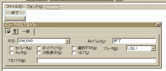 メニューアイテムのIDは左の図のように「終了」は、IDM_ENDに、