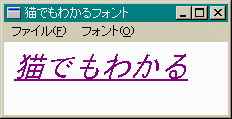 メニューの中のIDM_FONTが選ばれたときChooseFont関数が 実行されます。そして、この関数がTRUEを返したとき(OKボタンが 押されたとき)クライアント領域全体を書き直しています。//ウィンドウプロシージャ LRESULT CALLBACK WndProc(HWND hWnd, UINT msg, WPARAM wp, LPARAM lp) { static draw_on = 0; int id; HDC hdc; PAINTSTRUCT ps; HFONT hFont, hOldf; COLORREF crOldc; switch (msg) { case WM_COMMAND: switch (LOWORD(wp)) { case IDM_END: SendMessage(hWnd, WM_CLOSE, 0L, 0L); break; case IDM_FONT: if(ChooseFont(&cf) ==TRUE) { InvalidateRect(hWnd, NULL, TRUE); draw_on = 1; } break; } break; case WM_PAINT: hdc = BeginPaint(hWnd, &ps); hFont = CreateFontIndirect(cf.lpLogFont); hOldf = SelectObject(hdc, hFont); crOldc = SetTextColor(hdc, cf.rgbColors); if(draw_on) TextOut(hdc, 10, 10, (LPCTSTR)"猫でもわかる", 12); SelectObject(hdc, hOldf); SetTextColor(hdc, crOldc); DeleteObject(hFont); EndPaint(hWnd, &ps); break; case WM_CLOSE: id = MessageBox(hWnd, (LPCTSTR)"終了してもよいですか", (LPCTSTR)"終了確認", MB_YESNO | MB_ICONQUESTION); if (id == IDYES) { DestroyWindow(hWnd); } break; case WM_DESTROY: PostQuitMessage(0); break; default: return (DefWindowProc(hWnd, msg, wp, lp)); } return 0L; }