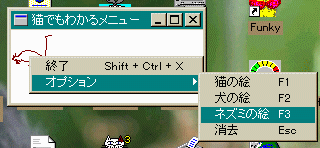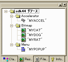 リソーススクリプトを手書きする人は、上のをコピーして使ってください。 そして、最初に///////////////////////////////////////////////////////////////////////////// // // Menu // MYPOPUP MENU DISCARDABLE BEGIN POPUP "表示されません" BEGIN MENUITEM "終了\tShift + Ctrl + X", IDM_END POPUP "オプション" BEGIN MENUITEM "猫の絵\tF1", IDM_CAT MENUITEM "犬の絵\tF2", IDM_DOG MENUITEM "ネズミの絵\tF3", IDM_RAT MENUITEM "消去\tEsc", IDM_CLR END END END ///////////////////////////////////////////////////////////////////////////// // // Accelerator // MYACCEL ACCELERATORS DISCARDABLE BEGIN VK_ESCAPE, IDM_CLR, VIRTKEY, NOINVERT VK_F1, IDM_CAT, VIRTKEY, NOINVERT VK_F2, IDM_DOG, VIRTKEY, NOINVERT VK_F3, IDM_RAT, VIRTKEY, NOINVERT "X", IDM_END, VIRTKEY, SHIFT, CONTROL, NOINVERT END ///////////////////////////////////////////////////////////////////////////// // // Bitmap // MYCAT BITMAP DISCARDABLE "mycat.bmp" MYDOG BITMAP DISCARDABLE "mydog.bmp" MYRAT BITMAP DISCARDABLE "myrat.bmp"