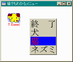 GetTextExtentPoint32(hdc, str[lpMI->itemData], lstrlen(str[lpMI->itemData]) - 1, &sz); 3番目の引数で文字数をそのまま使うと、用意される領域が少し長めになり 見た目が悪いので1を引いて調整しています。(こんなやり方が正しいのかどうか?どうも 1文字分だけよけいに領域が長くなるようです。) 最後にメッセージループを抜ける直前にDestroyMenuを実行しています。//ウィンドウプロシージャ LRESULT CALLBACK WndProc(HWND hWnd, UINT msg, WPARAM wp, LPARAM lp) { int id; static int sw = 0; //何を描画するかのスイッチ 1:犬 2:猫 3:ネズミ PAINTSTRUCT ps; RECT rc; HDC hdc; POINT pt; SIZE sz; HFONT hFont, hFontOld; enum {MENU_END, MENU_DOG, MENU_CAT, MENU_RAT}; LPCTSTR str[] = {"終 了", "犬 ", "猫 ", "ネズミ"}; switch (msg) { case WM_CREATE: hMenu = CreatePopupMenu(); AppendMenu(hMenu, MF_OWNERDRAW, IDM_END, (LPCTSTR)MENU_END); AppendMenu(hMenu, MF_OWNERDRAW, IDM_DOG, (LPCTSTR)MENU_DOG); AppendMenu(hMenu, MF_OWNERDRAW, IDM_CAT, (LPCTSTR)MENU_CAT); AppendMenu(hMenu, MF_OWNERDRAW, IDM_RAT, (LPCTSTR)MENU_RAT); break; case WM_MEASUREITEM: lpMI = (LPMEASUREITEMSTRUCT)lp; hdc = GetDC(hWnd); hFont = SetMyFont("MS 明朝", 30); hFontOld = (HFONT)SelectObject(hdc, hFont); GetTextExtentPoint32(hdc, str[lpMI->itemData], lstrlen(str[lpMI->itemData]) - 1, &sz); lpMI->itemWidth = sz.cx; lpMI->itemHeight = sz.cy; SelectObject(hdc, hFontOld); DeleteObject(hFont); ReleaseDC(hWnd, hdc); return TRUE; case WM_DRAWITEM: lpDI = (LPDRAWITEMSTRUCT)lp; rc = lpDI->rcItem; hdc = lpDI->hDC; hFont = SetMyFont("MS 明朝", 30); hFontOld = (HFONT)SelectObject(hdc, hFont); switch (lpDI->itemID) { case IDM_END: if (lpDI->itemState == ODS_SELECTED) { SetBkColor(hdc, RGB(0, 0, 255)); SetTextColor(hdc, RGB(255, 0, 0)); } TextOut(hdc, rc.left, rc.top, str[MENU_END], lstrlen(str[MENU_END])); break; case IDM_DOG: if (lpDI->itemState == ODS_SELECTED) { SetBkColor(hdc, RGB(0, 0, 255)); SetTextColor(hdc, RGB(255, 0, 0)); } TextOut(hdc, rc.left, rc.top, str[MENU_DOG], lstrlen(str[MENU_DOG])); break; case IDM_CAT: if (lpDI->itemState == ODS_SELECTED) { SetBkColor(hdc, RGB(0, 0, 255)); SetTextColor(hdc, RGB(255, 0, 0)); } TextOut(hdc, rc.left, rc.top, str[MENU_CAT], lstrlen(str[MENU_CAT])); return TRUE; case IDM_RAT: if (lpDI->itemState == ODS_SELECTED) { SetBkColor(hdc, RGB(0, 0, 255)); SetTextColor(hdc, RGB(255, 0, 0)); } TextOut(hdc, rc.left, rc.top, str[MENU_RAT], lstrlen(str[MENU_RAT])); break; } SelectObject(hdc, hFontOld); DeleteObject(hFont); return TRUE; case WM_RBUTTONDOWN: pt.x = LOWORD(lp); pt.y = HIWORD(lp); ClientToScreen(hWnd, &pt); TrackPopupMenu(hMenu, TPM_LEFTALIGN, pt.x, pt.y, 0, hWnd, NULL); break; case WM_COMMAND: switch (LOWORD(wp)) { case IDM_END: SendMessage(hWnd, WM_CLOSE, 0L, 0L); break; case IDM_DOG: sw = 1; InvalidateRect(hWnd, NULL, TRUE); break; case IDM_CAT: sw = 2; InvalidateRect(hWnd, NULL, TRUE); break; case IDM_RAT: sw = 3; InvalidateRect(hWnd, NULL, TRUE); break; } break; case WM_PAINT: hdc = BeginPaint(hWnd, &ps); DrawPic(hWnd, hdc, sw); EndPaint(hWnd, &ps); break; case WM_CLOSE: id = MessageBox(hWnd, (LPCSTR)"終了してもよいですか", (LPCSTR)"終了確認", MB_YESNO | MB_ICONQUESTION); if (id == IDYES) { DestroyWindow(hWnd); } break; case WM_DESTROY: DestroyMenu(hMenu); PostQuitMessage(0); break; default: return (DefWindowProc(hWnd, msg, wp, lp)); } return 0L; }