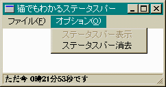 これは、ごく普通のメニューのリソース・スクリプトです。// status01.rc // 自前で書く人は#include <windows.h> // と#include 自前のヘッダーファイル(IDM_END, IDM_ONなどを定義) // を忘れないでください。 ///////////////////////////////////////////////////////////////////////////// // // Menu // MYMENU MENU DISCARDABLE BEGIN POPUP "ファイル(&F)" BEGIN MENUITEM "終了(&X)", IDM_END END POPUP "オプション(&O)" BEGIN MENUITEM "ステータスバー表示", IDM_ON MENUITEM "ステータスバー消去", IDM_OFF END END