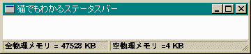 親ウィンドウが作られたらすぐに(WM_CREATE)、ステータスバーを 作ります。いつものように、InitCommonControls()関数を忘れないでください。 SetTimer関数もここで呼びます。LRESULT CALLBACK WndProc(HWND hWnd, UINT msg, WPARAM wp, LPARAM lp) { int id; static HWND hSBWnd; int sb_size[2]; static MEMORYSTATUS ms; char *str_org0 = "全物理メモリ = %ld KB"; char *str_org1 = "空物理メモリ =%ld KB"; char str[256]; switch (msg) { case WM_CREATE: InitCommonControls(); hSBWnd = CreateStatusWindow( WS_CHILD | WS_VISIBLE | CCS_BOTTOM | SBARS_SIZEGRIP, NULL, // 第1区画に表示される文字列 hWnd, // 親ウィンドウ ID_STATUS); // ステータスバーのID SetTimer(hWnd, ID_MYTIME, 500, NULL); break; case WM_TIMER: GlobalMemoryStatus(&ms); wsprintf(str, str_org0, ms.dwTotalPhys / 1024L); SendMessage(hSBWnd, SB_SETTEXT, 0 | 0, (LPARAM)str); wsprintf(str, str_org1, ms.dwAvailPhys /1024L); SendMessage(hSBWnd, SB_SETTEXT, 1 | 0, (LPARAM)str); break; case WM_SIZE: sb_size[1] = LOWORD(lp); sb_size[0] = LOWORD(lp) - 200; SendMessage(hSBWnd, SB_SETPARTS, 2, (LPARAM)sb_size); SendMessage(hSBWnd, WM_SIZE, wp, lp); break; case WM_CLOSE: id = MessageBox(hWnd, (LPCSTR)"終了してもよいですか", (LPCSTR)"終了確認", MB_YESNO | MB_ICONQUESTION); if (id == IDYES) { DestroyWindow(hWnd); } break; case WM_DESTROY: KillTimer(hWnd, ID_MYTIME); PostQuitMessage(0); break; default: return (DefWindowProc(hWnd, msg, wp, lp)); } return 0L; }